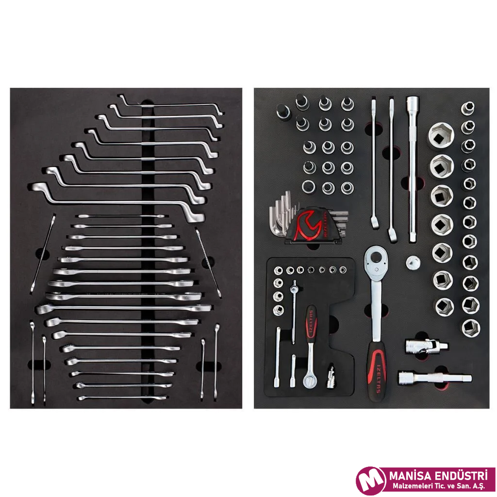 8 çekmeceden oluşan geniş depolama alanı, teleskopik raylı ve kilitlenebilir mekanizması ile hem güvenliği hem de düzeni sağlar. Tekerlekli yapısı sayesinde ergonomik hareket kabiliyeti sunarak, kullanıcıların iş sahasında dolabı rahatça taşımasına imkân tanır. Toplamda 206 parçadan oluşan set, kapsamlı bir el aleti çeşitliliği sunar. İçerikte;
