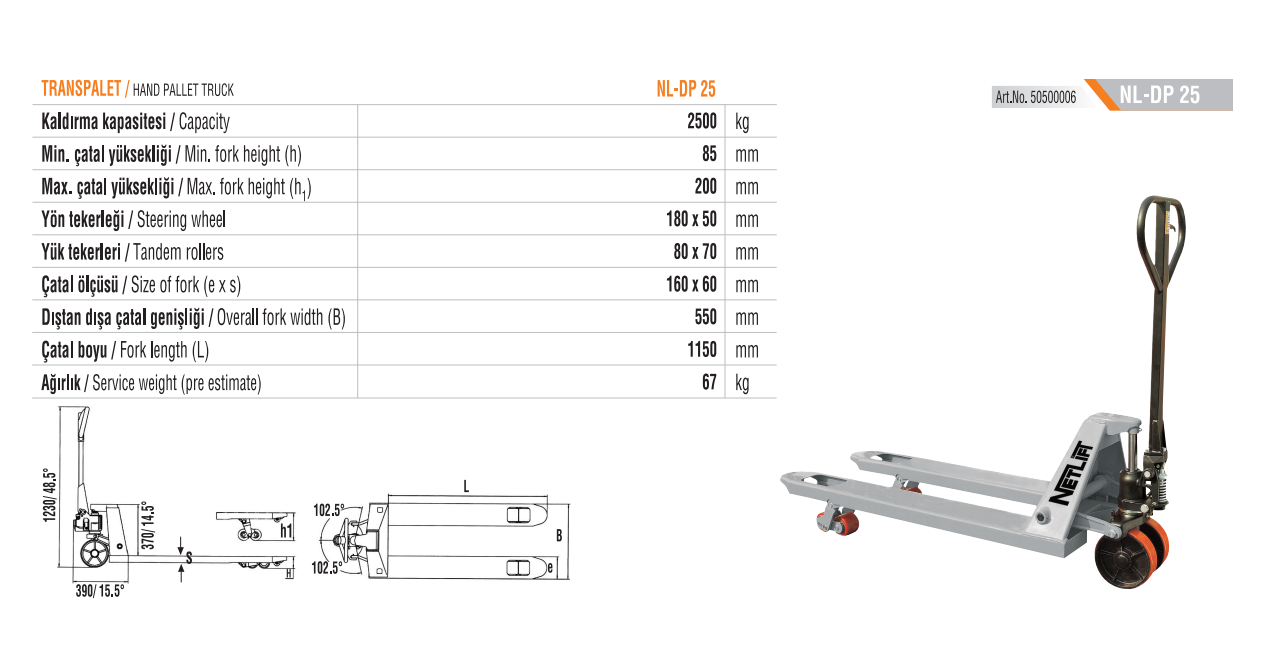 Standart 115 cm çatal boyundadır, standart Euro paletler için uygundur.